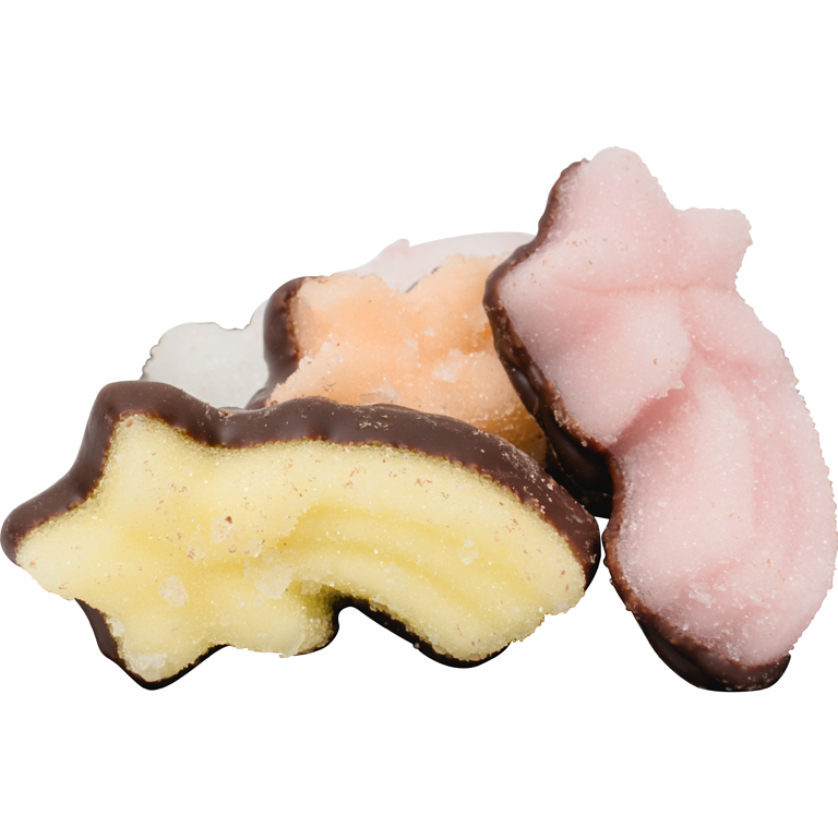 Fondant-Sternschnuppe mit Schokofuß | Artikelnummer: PS58130 – in den Geschmacksrichtungen: Zitrone, Himbeere, Orange und Vanille; 12,5g/Stück